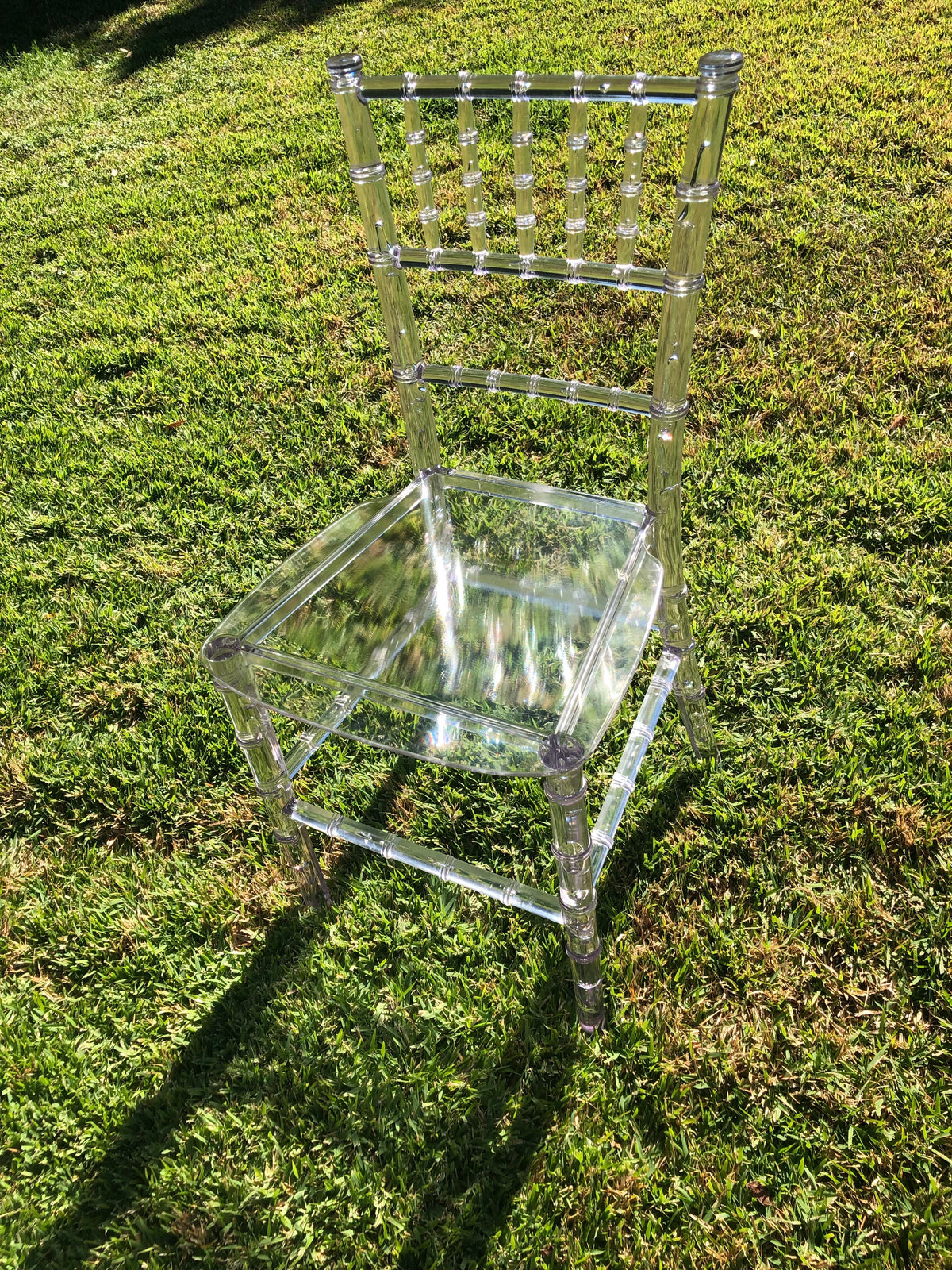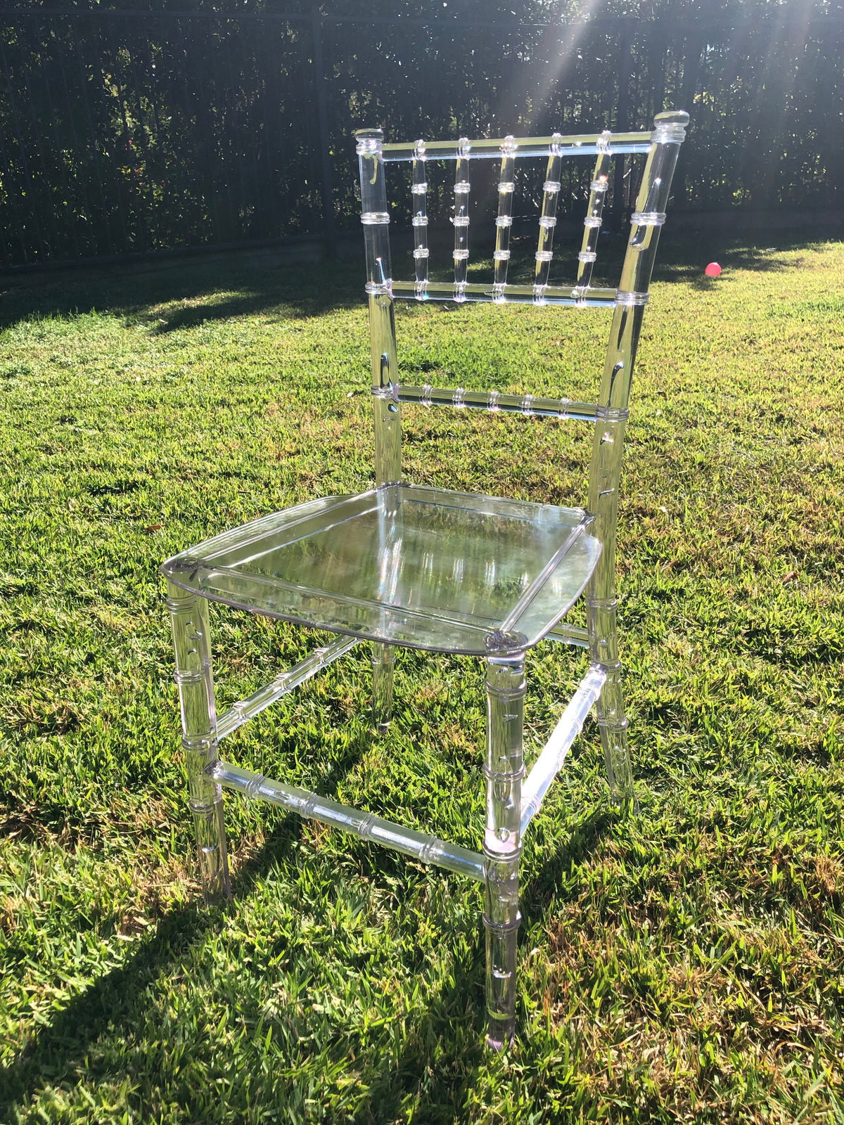 Setting up the Clear Tiffany Chiavari Chair is a breeze. Easy to stack and lightweight. These chairs are made from 100% Polycarbonate Resin (no metal inserts) which makes them very lightweight but still able to hold substantial weight. Due to their lightweight structure, they are super easy to transport. When the party is over and it is time to pack up they are very compact to store.