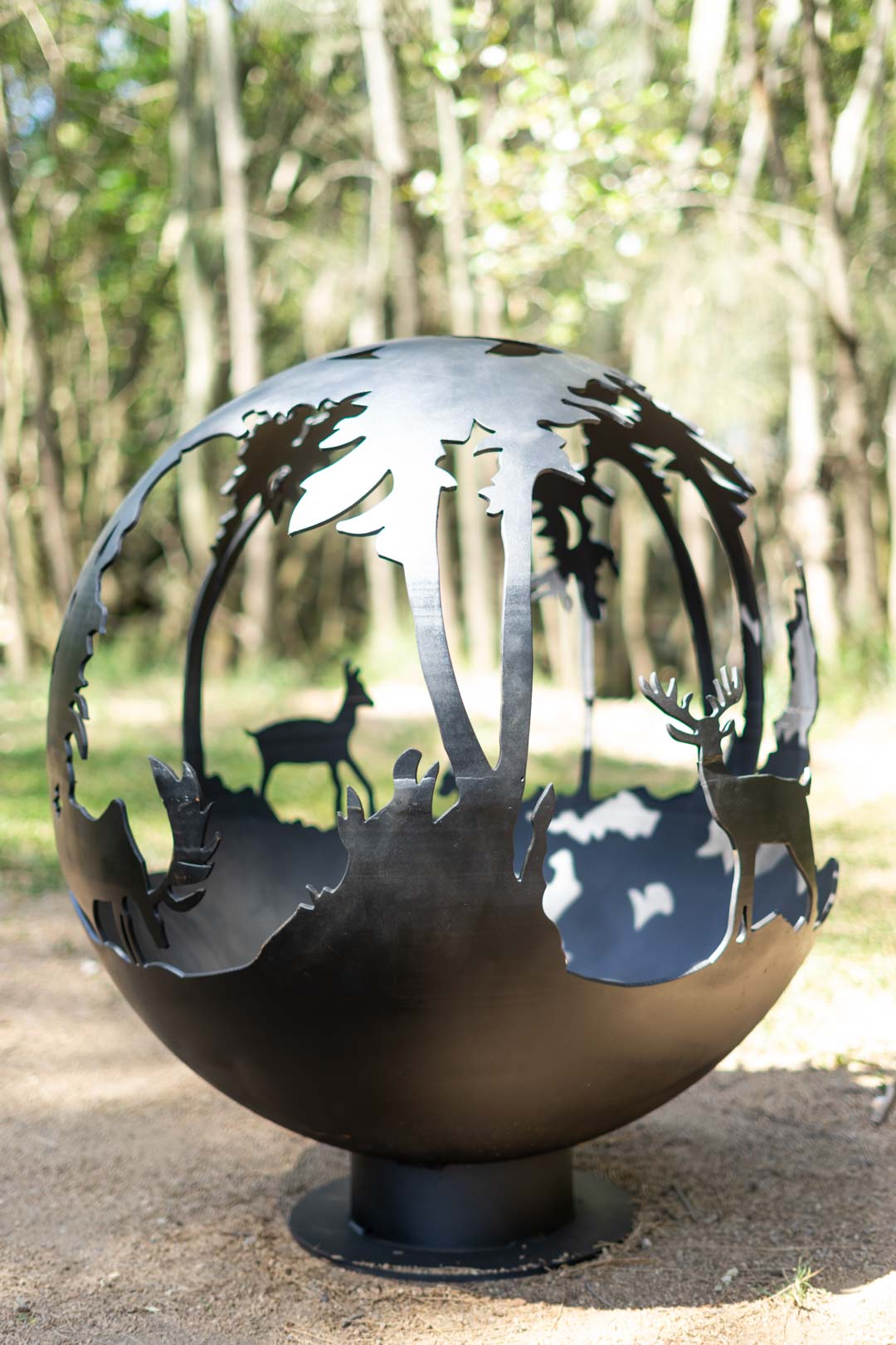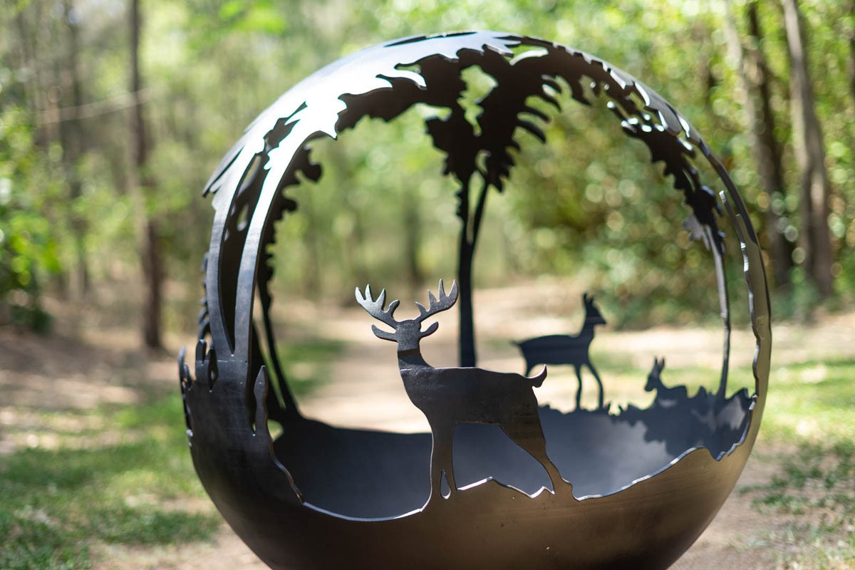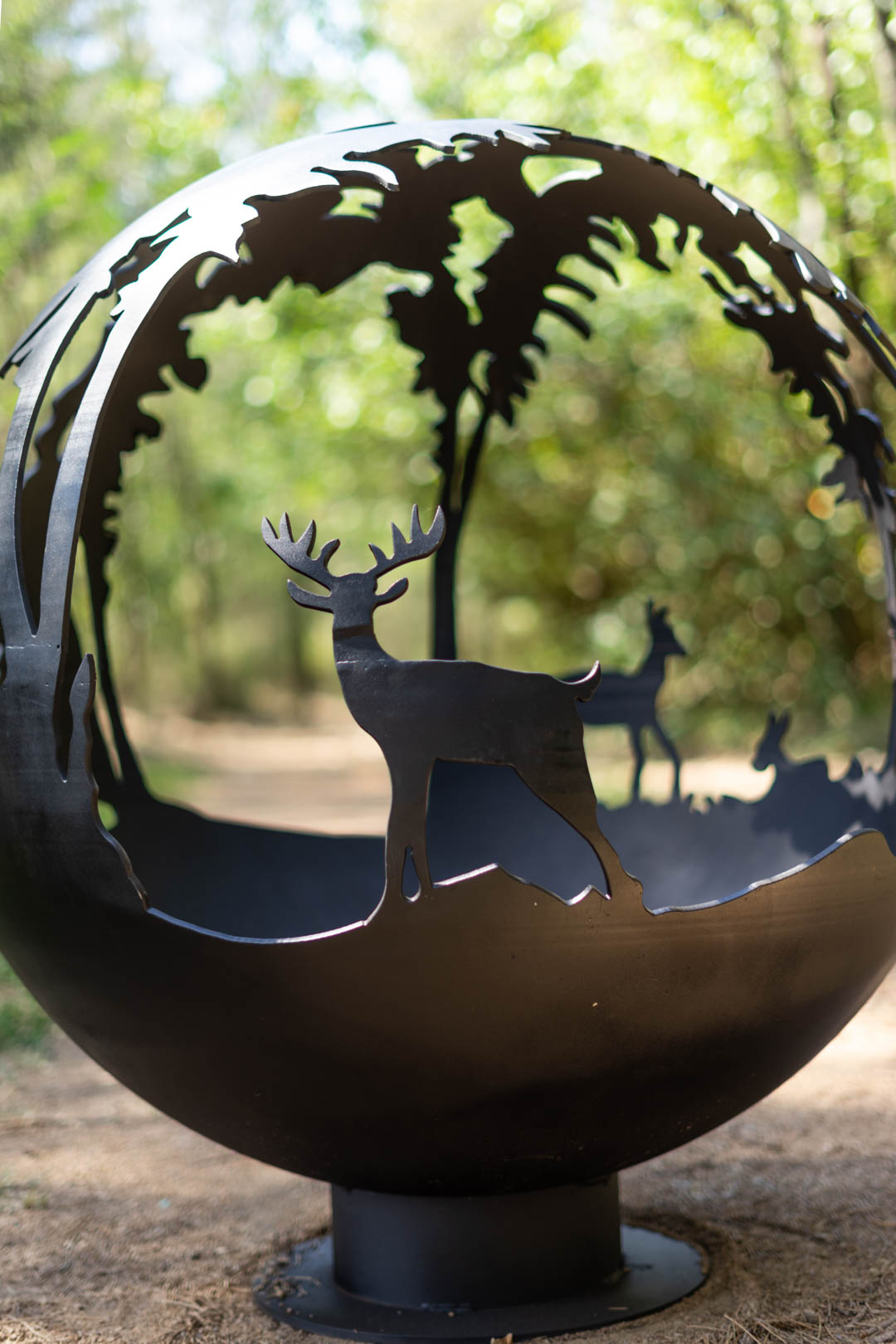 TKO Products "DEER MOUNTAIN" Fire Pit is a beautiful piece of artwork designed to impress you, your friends, family and keep you warm. With a few impressive deer scattered around this sphere with the tall trees of the forest, it will set the mood in your backyard.